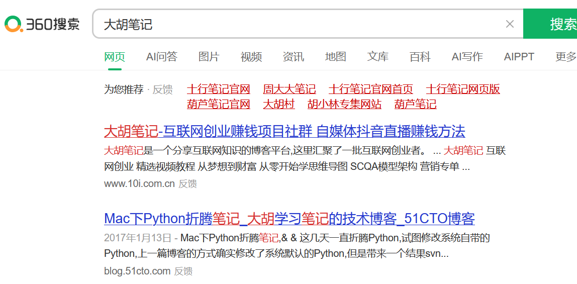 360搜索《大胡笔记》个人品牌词第一位