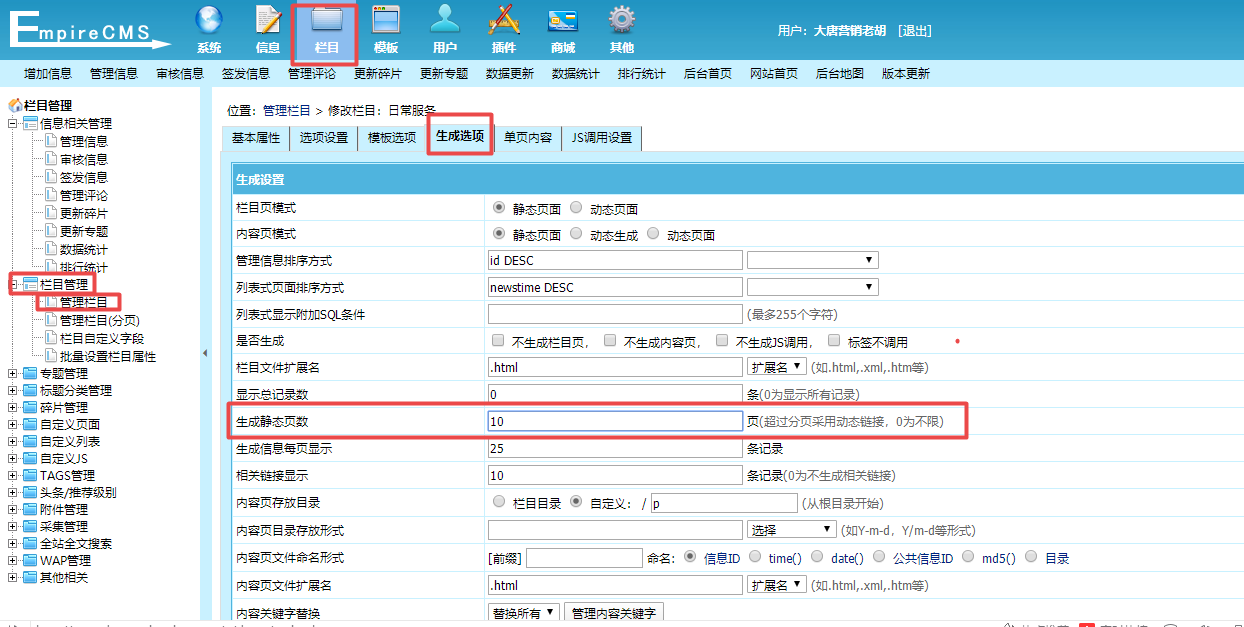 帝国cms网站后台:栏目》栏目管理》管理栏目》找到需要设置的栏目》修改》生成选项》